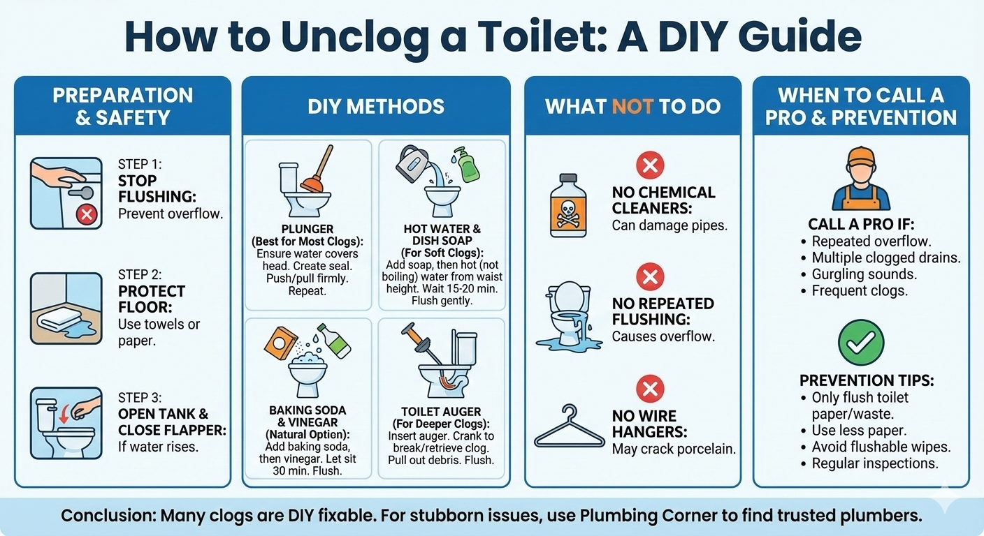 Unclogging a toilet on your own is often easier than you think. With simple tools like a plunger or auger and the right techniques, you can solve most toilet clogs safely. For stubborn or recurring issues, use Plumbing Corner to find trusted plumbers near you who can fix the problem quickly and professionally.